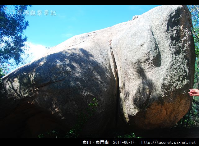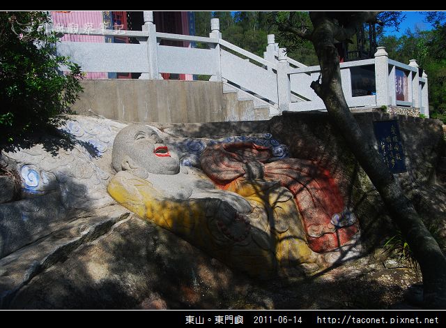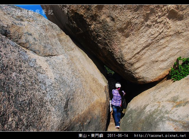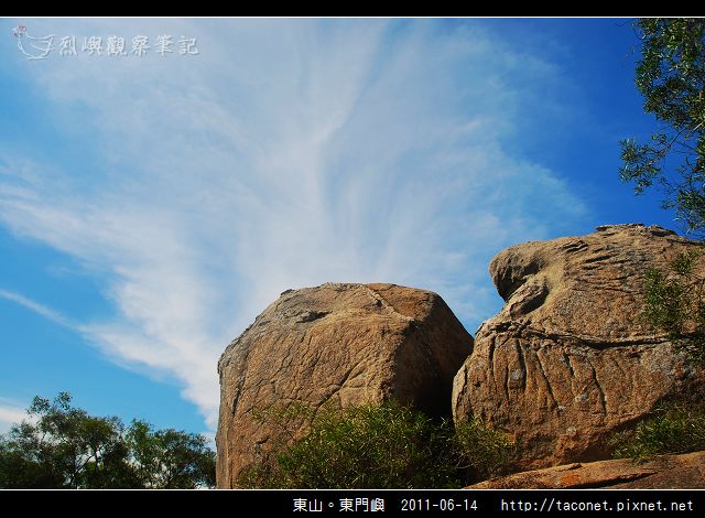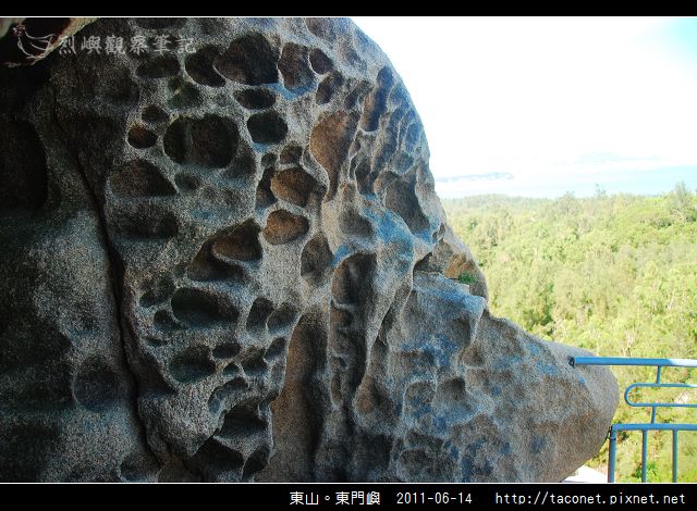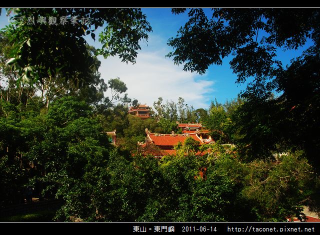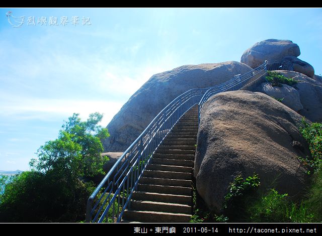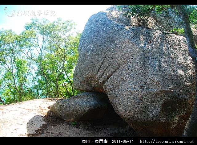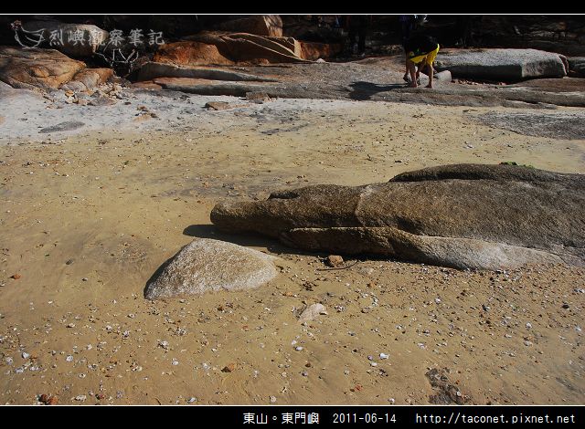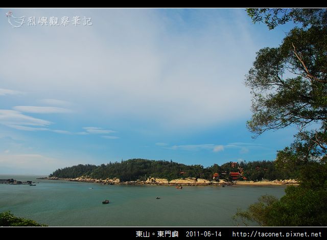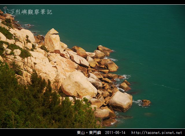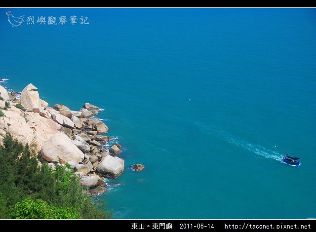 東門嶼南段,是景區的主要區段,這裡自然景觀與人文景觀巧妙地結合起來,並達到天衣無縫的地步;中段是連接南段和北段的紐帶,是一段長約200米的條形沙帶,其東西兩邊都是瀕海沙灘,中間部分是南北走向的林帶。東邊的沙灘叫“北澳尾”,西邊的沙灘叫“大澳底”。造物主有意在這怪石嶙峋的海崖間創造這舒坦的芳草長堤,使之與怪石相益得彰。倘若踫上好天氣,在這芳草長堤上觀日出,那是再好不過了;北段是一片末開垠的處女地。這裡的許多地方,是帶有原始的、野性的海浪、礁石、綠樹。在西南地方,有一個幾乎是浮在海面,又匍匐於低矮小山的寺廟。