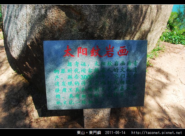在東門嶼主峰文峰塔東側約三四十米處的山坡岩石上,發現了七八處太陽紋岩畫,形成一處頗為壯觀的太陽紋岩畫群。岩畫的西側、北側、東北側和東側均巨岩林立,抬頭見石,東南側與南側則視野開闊,面對一望無際的大海。縱貫山頂的小徑經過岩畫北側,岩畫南側2米外為主峰的陡坡。岩畫的正前方(東)略偏北處有一塊巨石相對,岩畫與巨石之間相距3米,形成一塊約12平方米的平地。此外,岩畫的南側與東南側另有小面積平坦的岩面。
